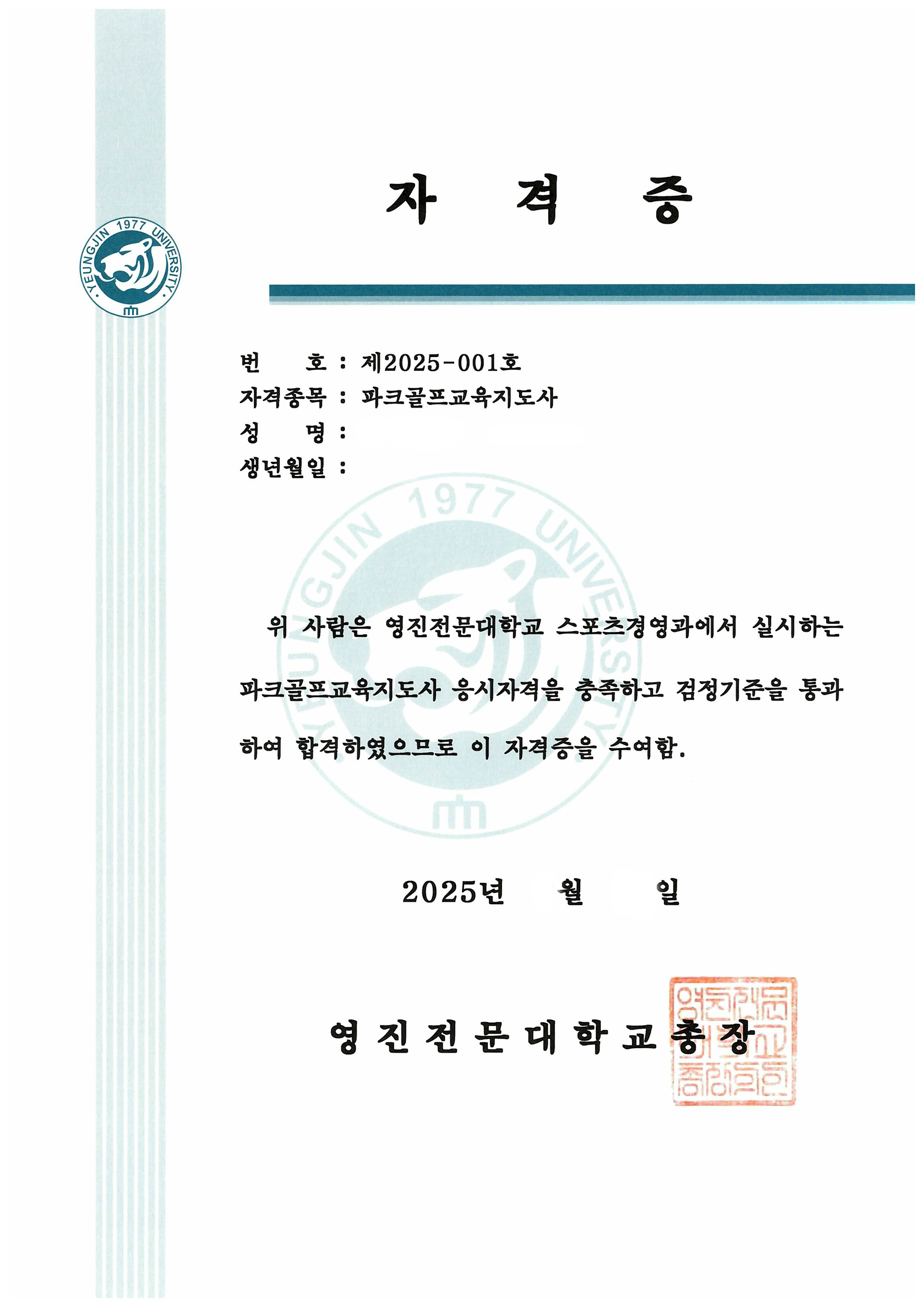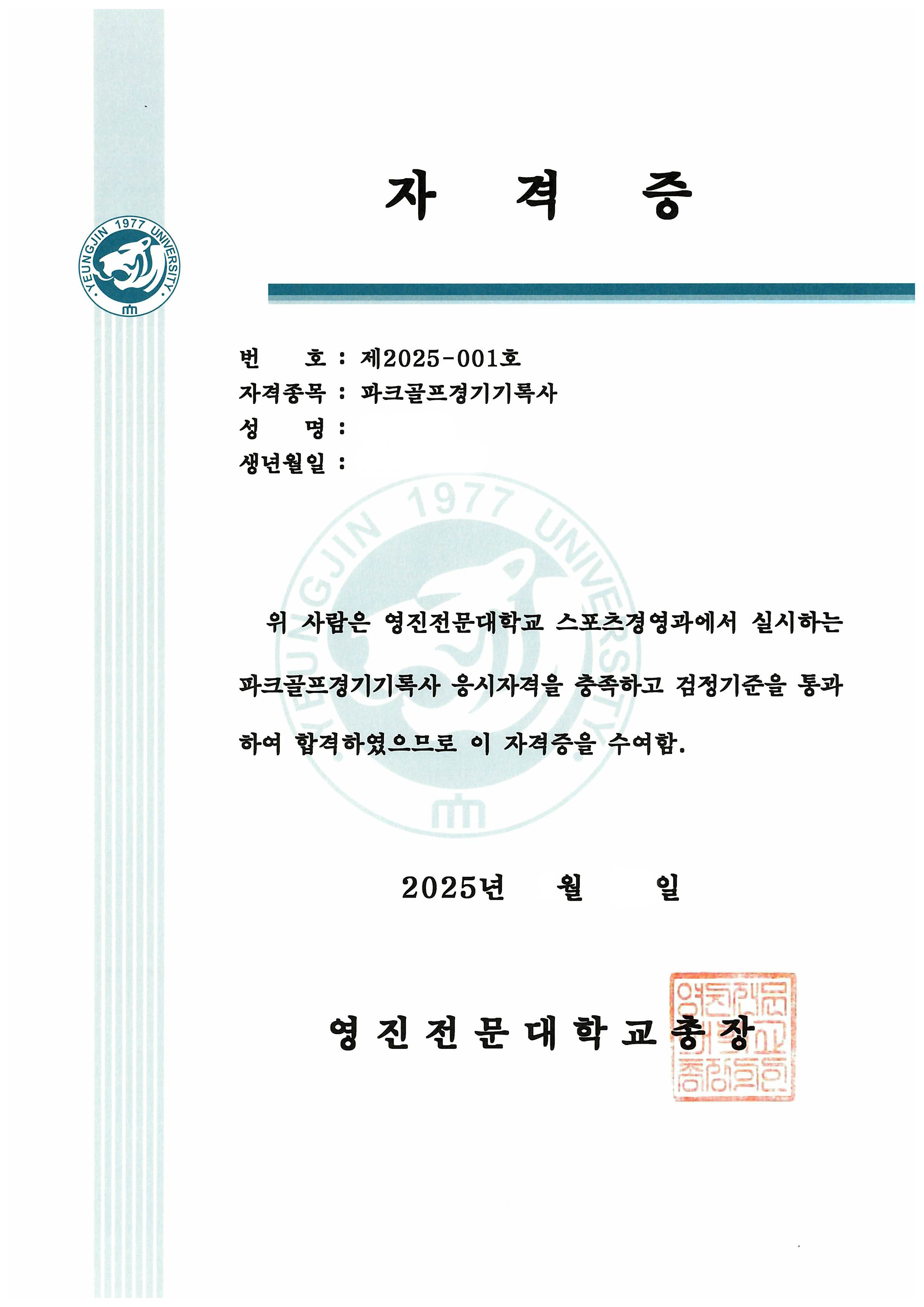 전국1호 파크골프학과개설 영진전문대학 총장명의로 발급되는 "전문학사학위와 함께 취득 할 수 있는 특별한 자격증"