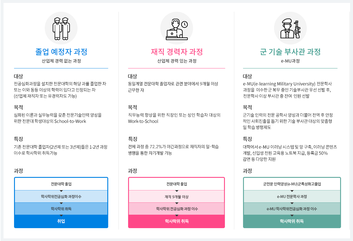 기타 유의사항 원서접수가 완료된 후 접수된 서류는 일체 반환하지 않습니다. 입학이 허가된 후에도 부정한 방법으로 입학한 사실이 확인될 경우 입학을 취소합니다. 학과동일성 등 지원자격 심사는 전공심화과정 교육과정편성위원회에서 심의한 사항을 따릅니다. 본 모집 요강에 명시되지 않은 사항은 대학 내 전공심화과정 운영위원회에서 심의, 결정한 사항에 의거합니다. 입학전형 관련 성적은 공개하지 않습니다. 입학관련 서류에는 부모 및 친·인척의 성명, 직장명 등 신상에 대한 기재를 금지하고, 기재시 불이익 조치를 받을 수 있습니다. 동일학과 내 주간/야간 복수지원 가능합니다.